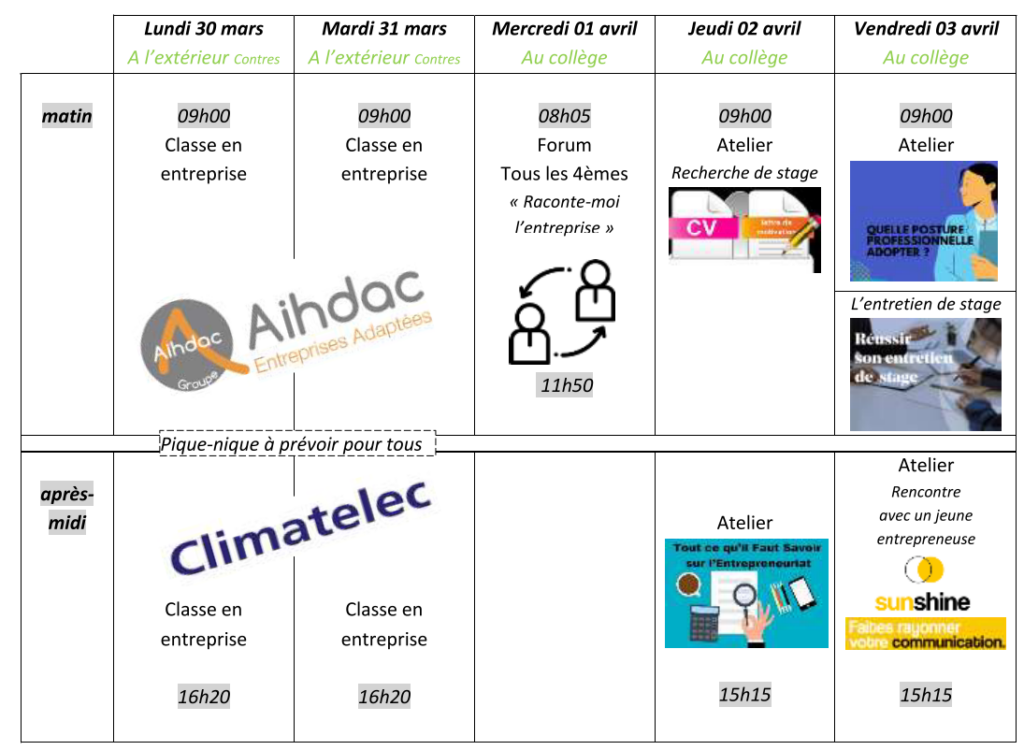 Les élèves de 4ème suivant l’option Parcours Avenir Augmenté, ont bénéficié durant la semaine du 30 mars au 03 avril d’un programme riche en actions et évènements pour en savoir davantage sur les entreprises, les métiers et les formations. Merci à tous les intervenants extérieurs qui chaque année répondent présents pour rencontrer et échanger avec ces collégiens.